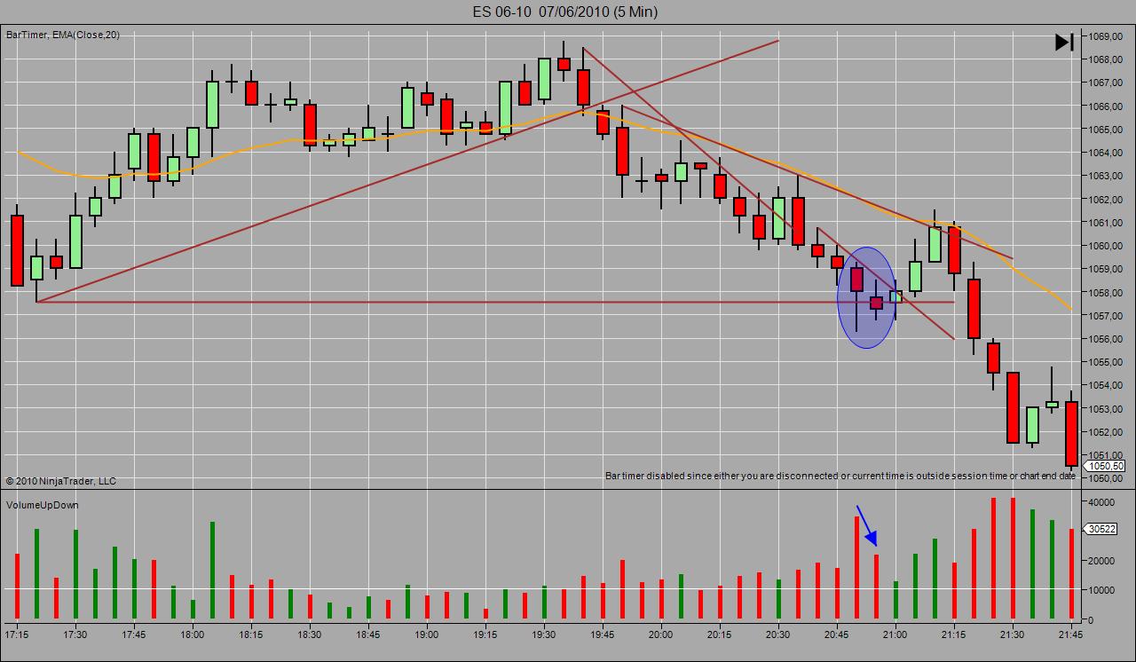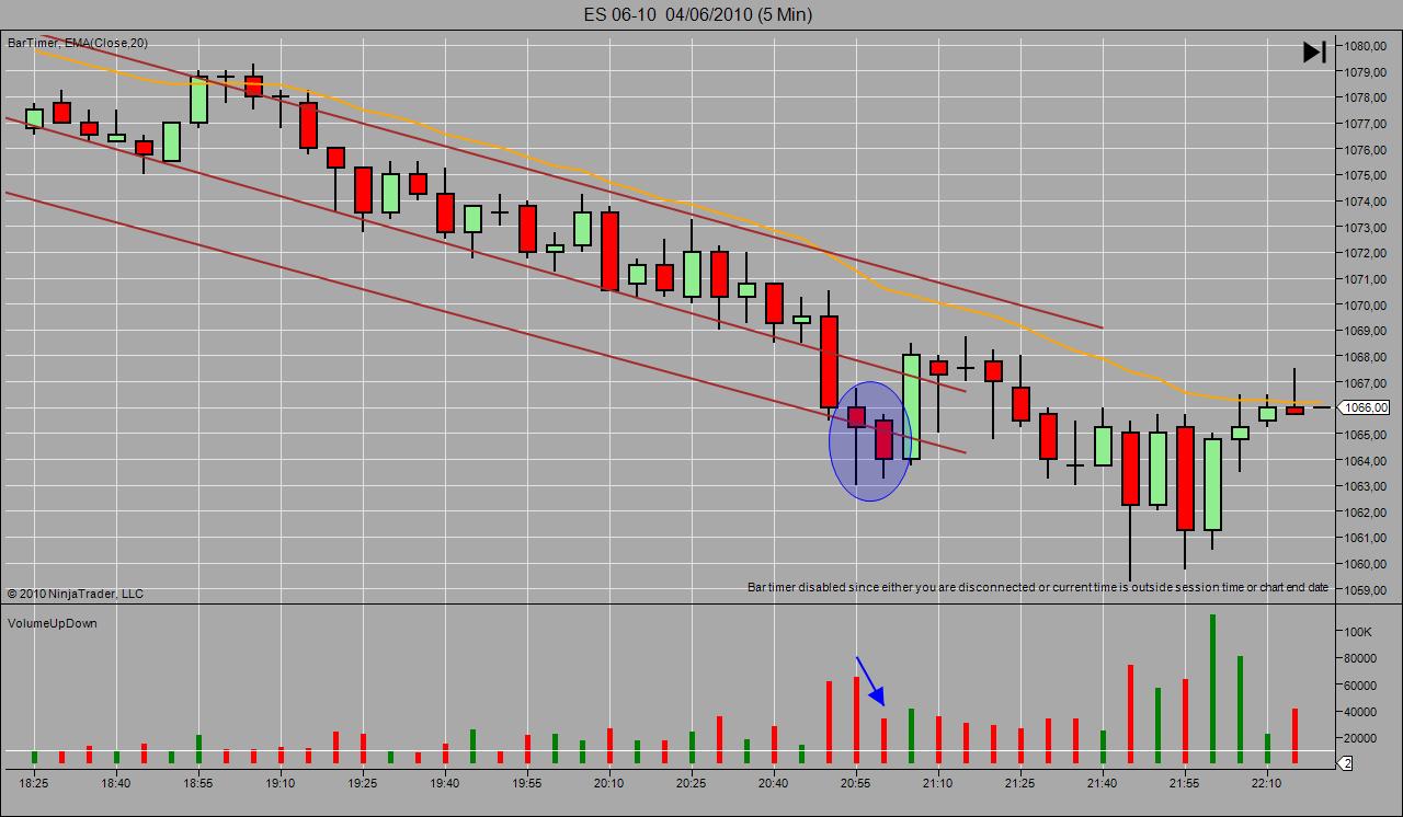 Es los graficos que adjunto se puede ver una vela con una larga cola inferior (ha cerrado lejos de su minimo) y un fuerte aumento de volumen (han entrado comprando). A continuacion una vela que está dentro de esta (inside) es decir un minimo mas alto y un maximo mas bajo que la vela anterior y con un fuerte descenso de volumen. Buena señal para obtener un scalp (1 punto) y con un stop muy cerca (bajo riesgo).