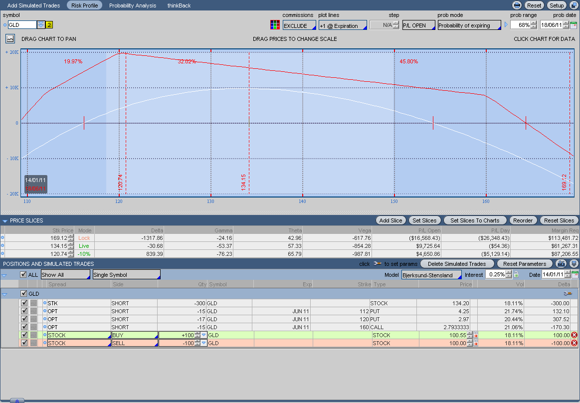 Hoy vamos a hacer un pequeño ajuste, ya que el oro parece estar haciendo máximos temporalmente, como el mercado esta cerrado y no voy a poder estar luego, he vendido 300 stocks del GLD por 134,2, así dejo la Delta un poco negativa (-30), mi intención es re-comprar estas 300 acciones sobre 128-130, pero ya veremos...