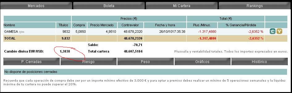 Y luego está el "trade oculto", que no es moco de pavo.....te está aplicando la diferencia cambiaria entre la divisa del concurso y su cruce eurusd......nada menos que tenemos un trade cambiario equivalente a una posición de 0.5 lotes en forex a contado, (50.000 moneditas en el templo de los mercaderes.) :-) .