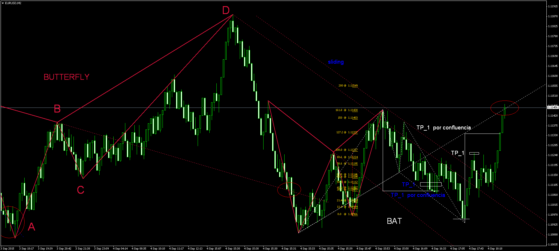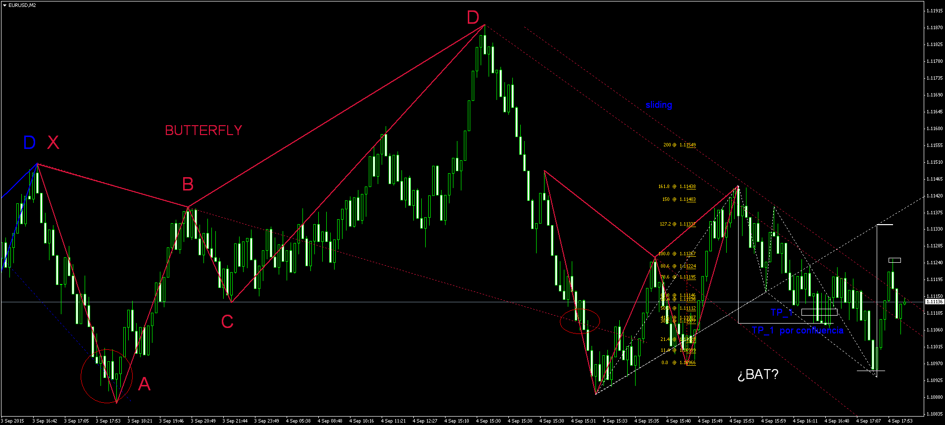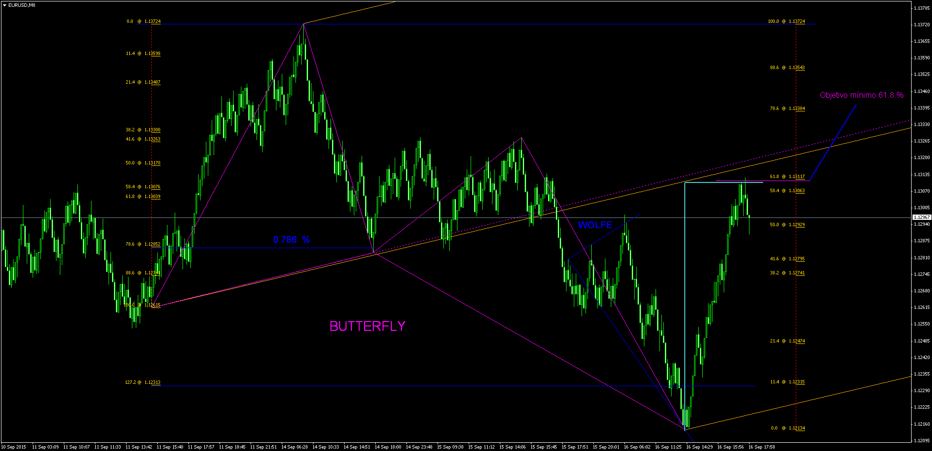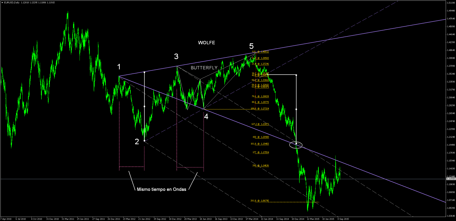 Pongo un gráfico de un Wolfe en diario, que no es más que una cuña alcista, pero claro no es lo mismo entrar arriba que cuando rompe la TrendLine, apoyado por un Butterfly bajista el cual refuerza el patrón y el recorrido