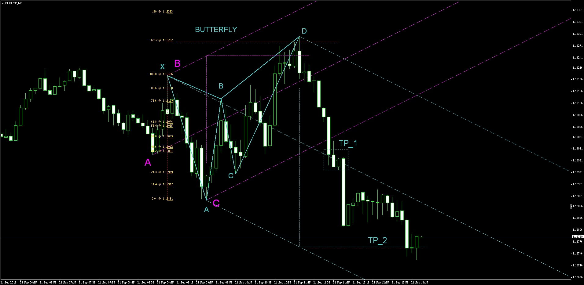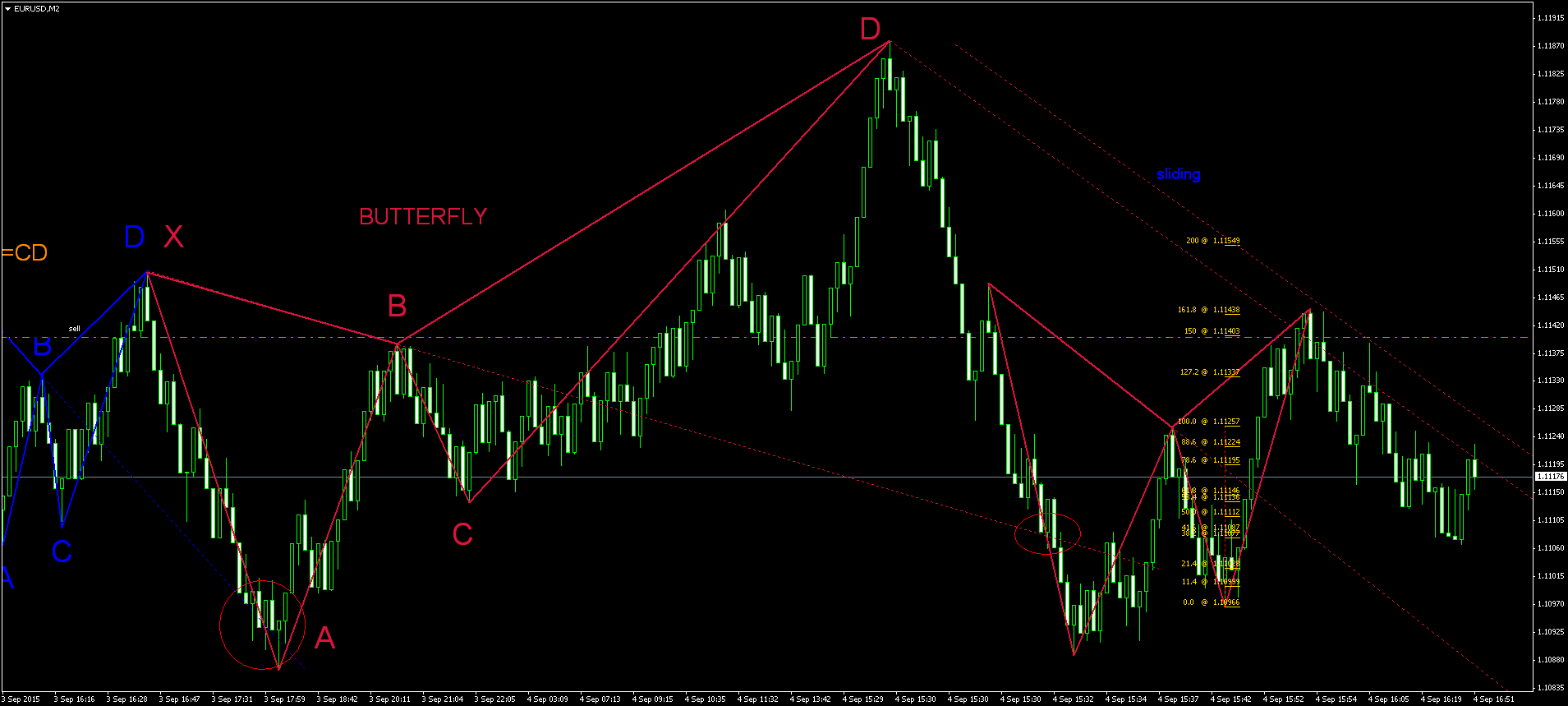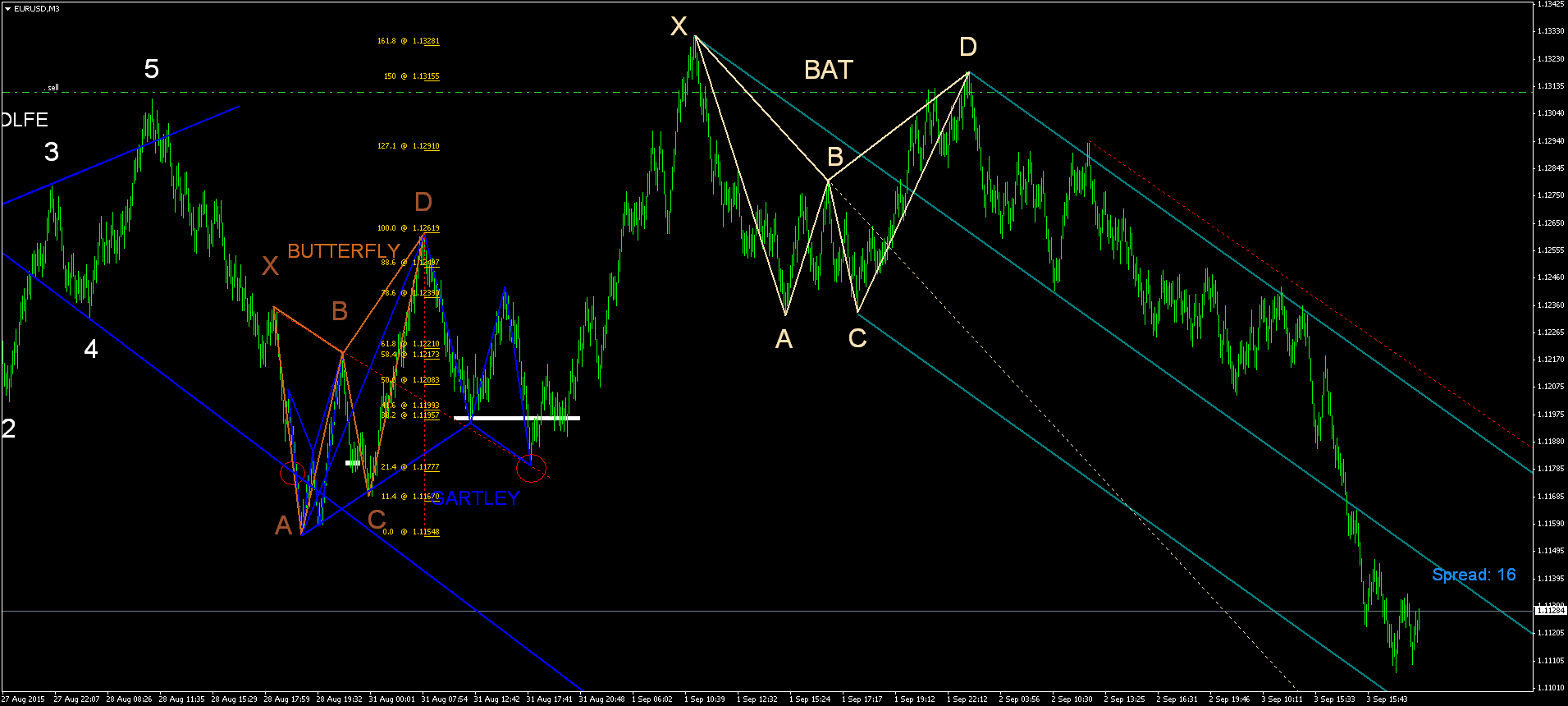 Pongo un gráfico de un Wolfe en diario, que no es más que una cuña alcista, pero claro no es lo mismo entrar arriba que cuando rompe la TrendLine, apoyado por un Butterfly bajista el cual refuerza el patrón y el recorrido