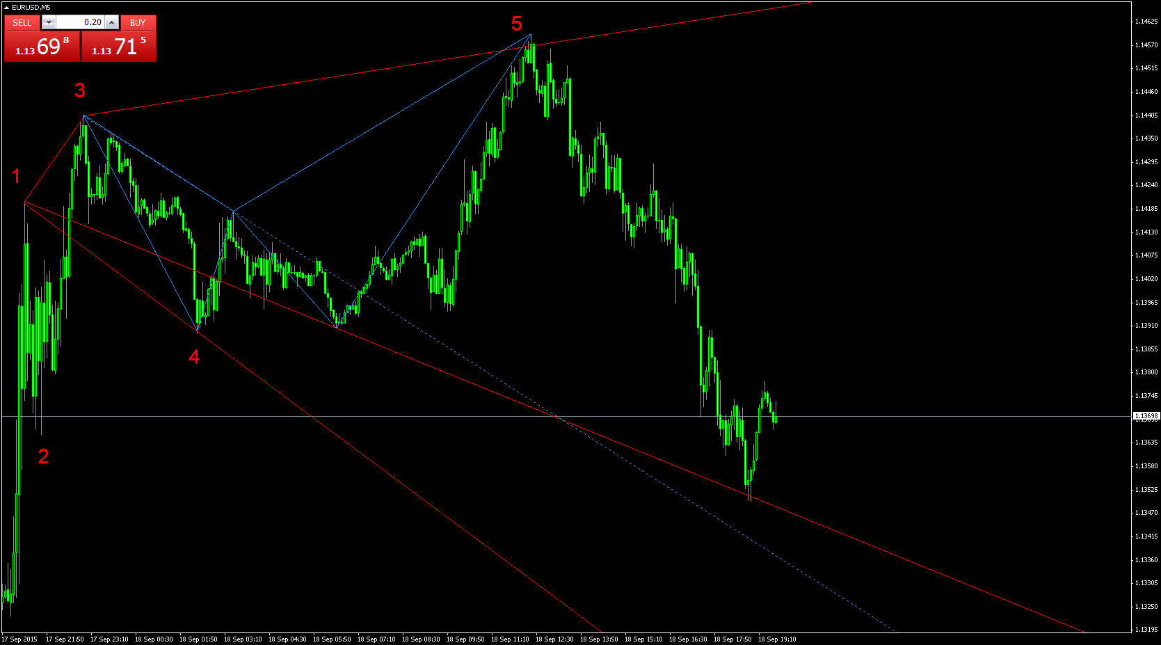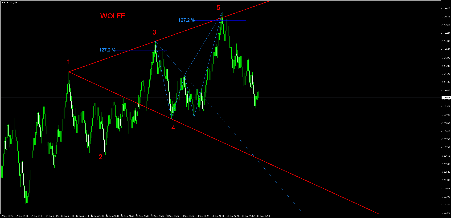 El gráfico de ese wolfe es de velas de rangos, pero si te lo marcas en gráfico de una hora está ya cumplido, puesto que el precio ya ha tocado la 1-4 y ahí se acaba la pauta...¿Qué hará después? pues dependerá de la estructura que haya hecho o esté haciendo el precio.