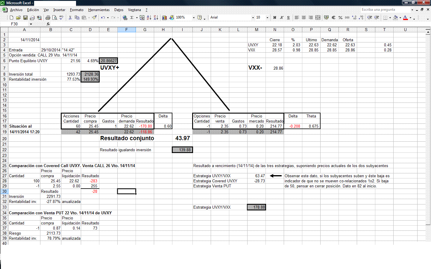 Tanto en la estrategia que inicie BRZU/EWZ como en esta última, he llegado a la conclusión que han resultado positivas por la amplia cobertura que da este sistema, ya que las dos valores que tenían acciones bajaron mucho, y sin embargo las estrategias tuvieron beneficios. Mi conclusión es que los valores sobre los que se vendieron las CALL, al ser de mayor nominal, la prima era mayor. Sobre todo en esta última UVXY/VXX, con el mismo riesgo su beneficio (y no pérdida) en casi el doble. Esto para los vendedores de PUT (que en definitiva es lo que he hecho) cargadas de volatilidad resulta interesante y lo voy a seguir usando.