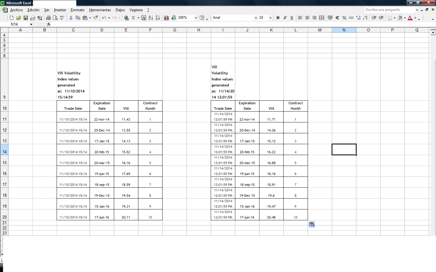 Doy por terminada la estrategia UVXY/VXX, ha terminado con beneficios. Por mi parte he rolado la CALL vendida y voy a seguir bajando el punto de equilibrio de UVXY mientras pueda, aunque creo que eso no interesa a nadie, como veo que no interesa mucho este post. A "groso modo" pensaba que la volatilidad iba a bajar, ya que el SP estaba subiendo, pero no ha sido asi, adjunto imagen del VIX con referencias 10/11/14 y 14/11/14, supongo que el mercado espera "algo".