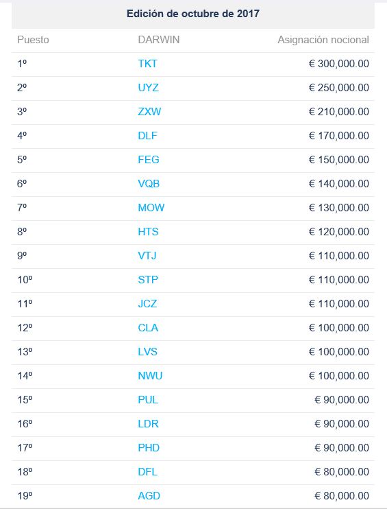 De nuevo vuelvo a estar entre los 48 primeros, este mes de octubre quedé en el puesto Nº19 con un asignación de 80.000 USD. La rentabilidad del Darwin AGD ese mes fué de un +6,15%.