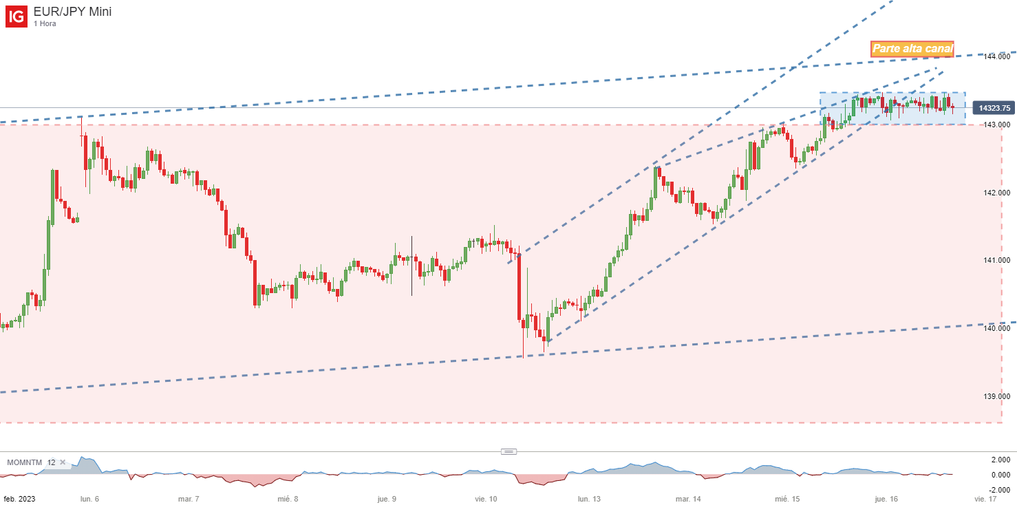 disols escribió: 16 Feb 2023 17:00 EUR_JPY Mini_20230216_16.59.pngHe cerrado la posicion asumida hace dos dias en EUR/JPY con perdidas de 50 pics porque las circunstancias a mi forma de ver el valor han cambiado....además de un lateral esta metido en un canal alcista...voy a entrar corto en la parte alta del canal en cuanto me deje....envío grafica de 1h. entrare corto en alrededores de 144