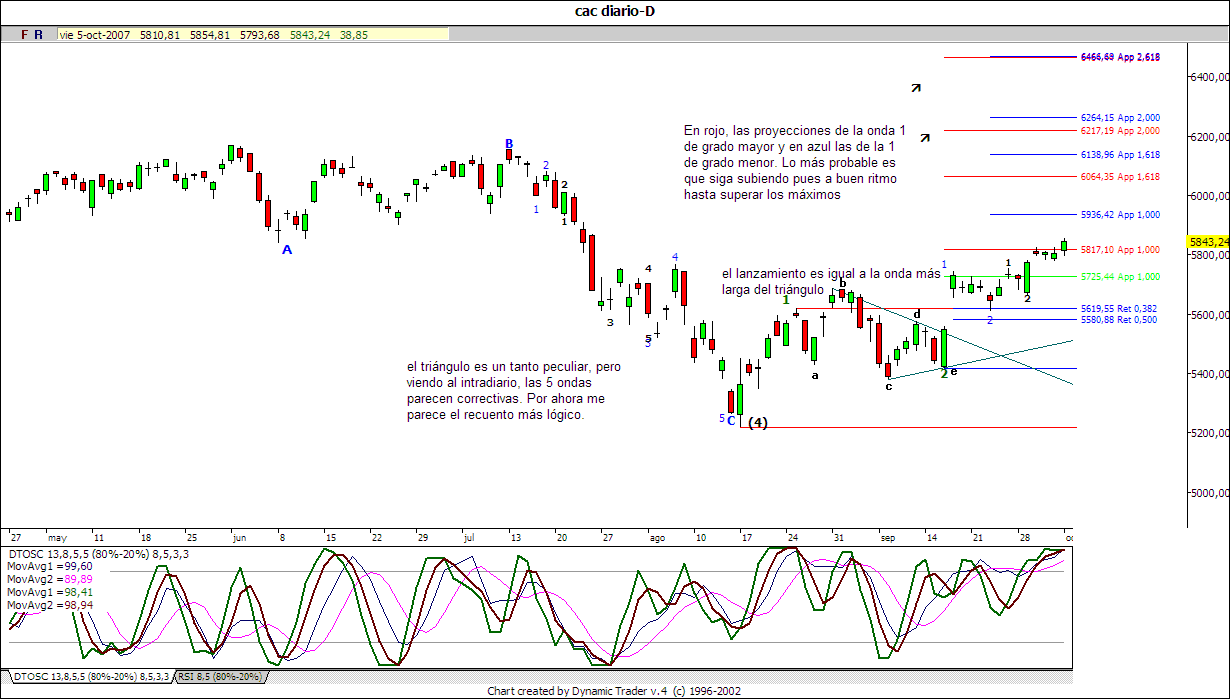 En el mercao en general estoy imbécil esta semana, mi análisis primero, corto en el dax, era el correcto, pero el gap me cortó meterme y los vaivenes me despistaron cobarderrrr. Ahora tengo un recuento que en el cac me señala onda 4 por lo que habría subida a la vista, pero no estoy muy seguro de si es correcto, porque tampoco estoy seguro si la subida anterior es una C o una tercera. En fins, personalmente creo que es una 4 y ahora viene la 5.