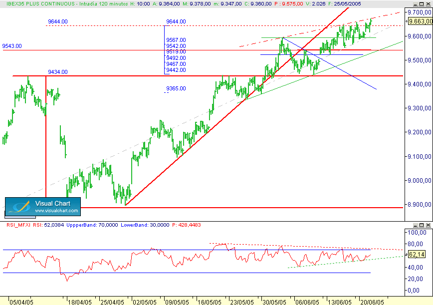 Por un lado tenemos esa directriz alcista principal del doble 8900 perforada como deciamos hace par de dias y confirmada como resistencia. Tenemos la extensi0n del bajista de vencimiento de Mayo 9433-8885 perfectamente cumplido en 9643. Tenemos unas divergencias considerables y con tendencia en RSI de caracter bajista q vienen desde los 9433. Tenemos un mAximo en 9593 roto a la baja cuando debería haber funcionado de soporte. Y tenemos esa resistencia en 9645 q ha funcionado perfectamente.