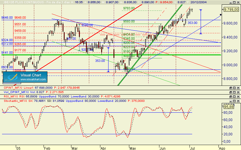 Weno, pues 9800 habemus y con pasta entrando con esos 74k (k=kilo=1000) contratos abiertos q acompañan a la tendencia. En cuanto a las posiciones largas la cosa estA simple puesto q hay una directriz alcista perfecta desde el principio de este movimiento en los 95xx q por debajo de los 9775 quedaría perforada así como un nuevo soporte roto cuando debe funcionar como tal. Las divergencias bajistas con osciladores tb indican cierta "premonici0n" de realizaci0n de beneficios pr0ximos, y entre otras cosas vemos q esa directriz alcista en verde de la q hablabamo ha funcionado de momento como resistencia, y en caso de superarse y con 9850 como un objetivo fibo en 9900 se encontraría con la original alcista ahora en rojo desde los 8900, así q de ahí para arriba y continuando con las divergencias y sin corregir, la ansiedad entre otras cosas muy probablemente provocase ventas. Mientras tanto por debajo de los 9760 aparecen los anteriores mAximos en 9735 y por debajo de 9716 ia podríamos empezar a hablar de una correcci0n algo maior y en 9709 tendríamos el 0.4 de este ULtimo alcista y ya por los 9650 encontramos el 0.6 de este alcista y esa proyecci0n fibo del alcista q ha funcionado en este movimiento alcista. Así q por debajo del 9650 el escenario ha cambiado y bastante mAs por debajo del 9600.