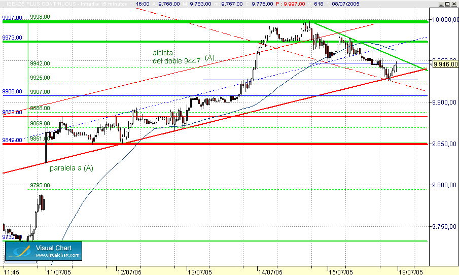 De momento un doble techo en los 10000 con pull a los 9973 se ha producido y esos 9950 dirAn si se confirman como pauta de giro o no es mAs q una ligera correcci0n con los objetivos cumplidos.