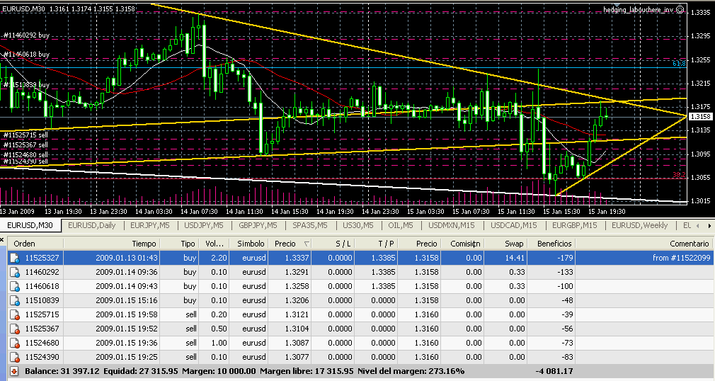 Si tuvieramos previsto un rango lateral para la próxima semana, esta situación de las posiciones es ideal, ya que están distribuidas, excepto las buy, y además nos queda un margen libre de unos 19.000 euros aprox. 2/3 de la cuenta. En 2008 tuve un hedge abierto unos 2,5 meses seguidos y fué muy rentable, en Junio-Julio que el eurus estaba en un rango lateral ámplio.