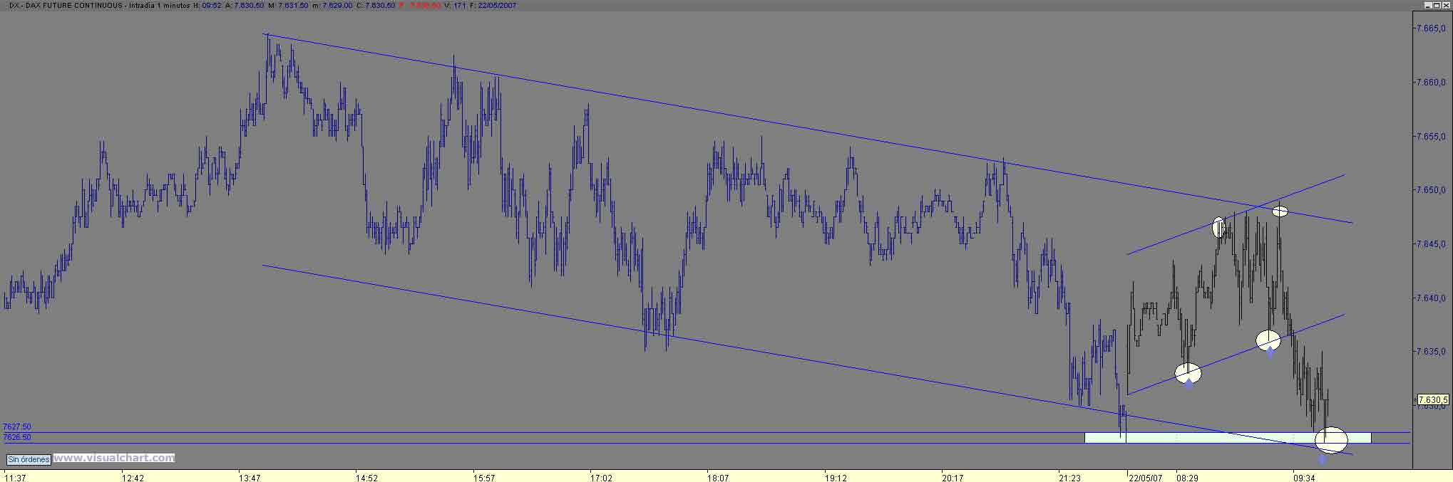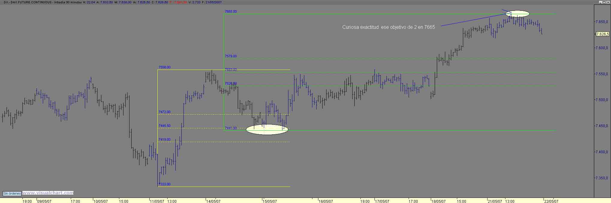 B noches hoy con poco tiempo para escribir tras superar los 7557 nos fuimos a buscar el 7664.50 comp maximo (observad el graf de 30m que os pongo) desde ahi vaivenes con maximos decrecientes en esa especie de canal bajista hasta llegar al nivel del 7336 38 (61 de Fibo del movt diario y nivel de control) con rebote a la parte alta del canal 7655 y maximo anterior , lo dicho esta mañana`poco rango aunque operaciones interesantes Saludos y hasta mañana