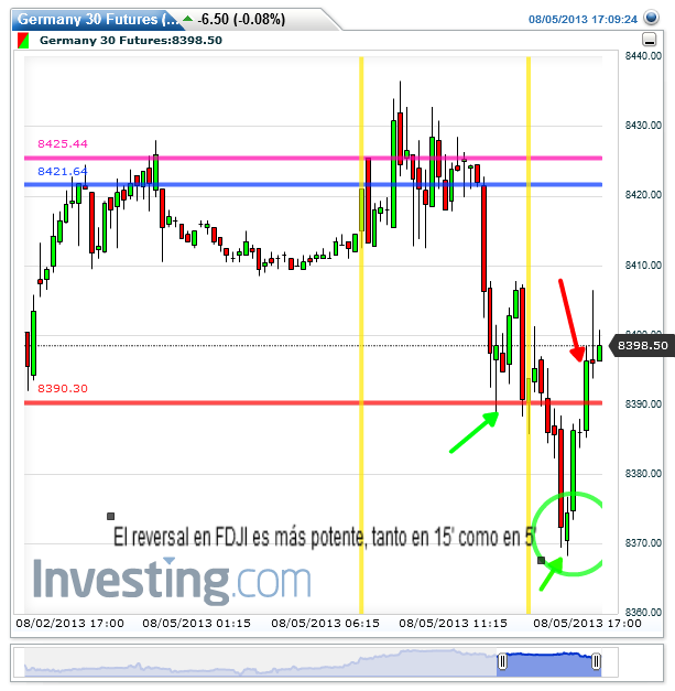 b) Long +1@ 8.373 en la barra que empieza en 15:45. Racional: Pese a no alcanzar Z2, por extensión de rango e interpretando la poderosa barra que forma El FDJI en esa misma barra, un martillo bastante claro en barra de 15' y un reversal más claro aún en barra de 5'. En el FDAX no está tan claro el reversal, pero se asume que el índice centroeuropeo seguirá "servilmente" a su homólogo yankee.