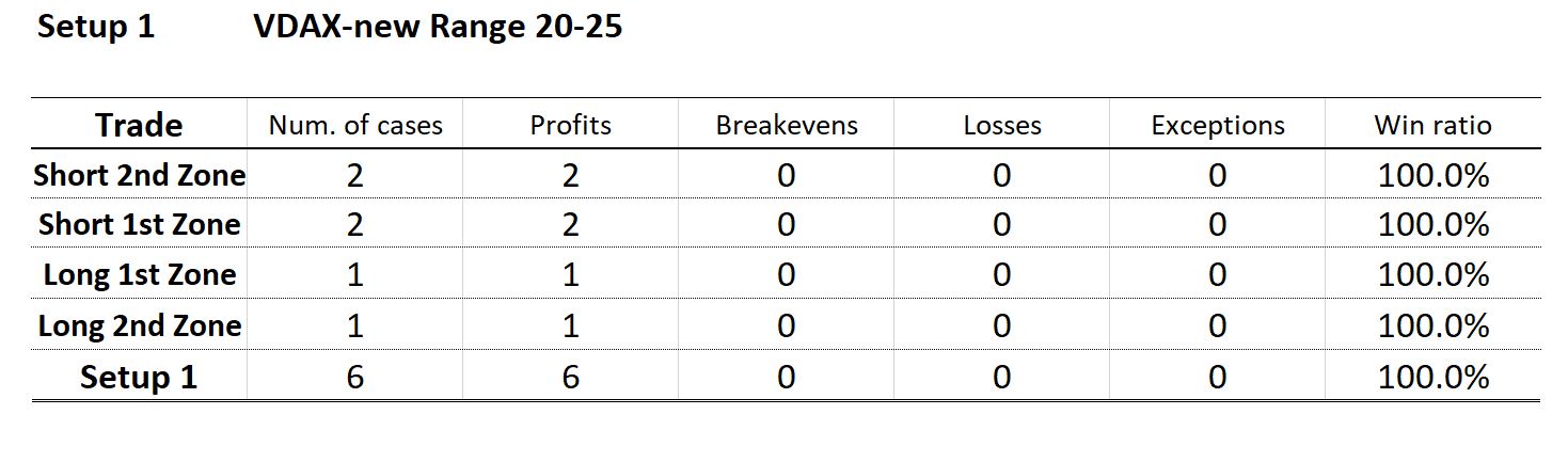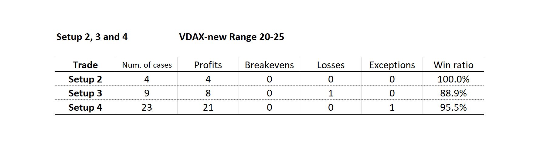 1) al igual que hacemos con el resto de estadísticas he analizado los datos por nivel de volatilidad, por lo que de los 100 días analizados, el 47 que aparece en la tabla nos indica que durante 47 días, el FDAX cotizó con valores de volatilidad comprendidos entre 20 y 25 del VDAX-new.