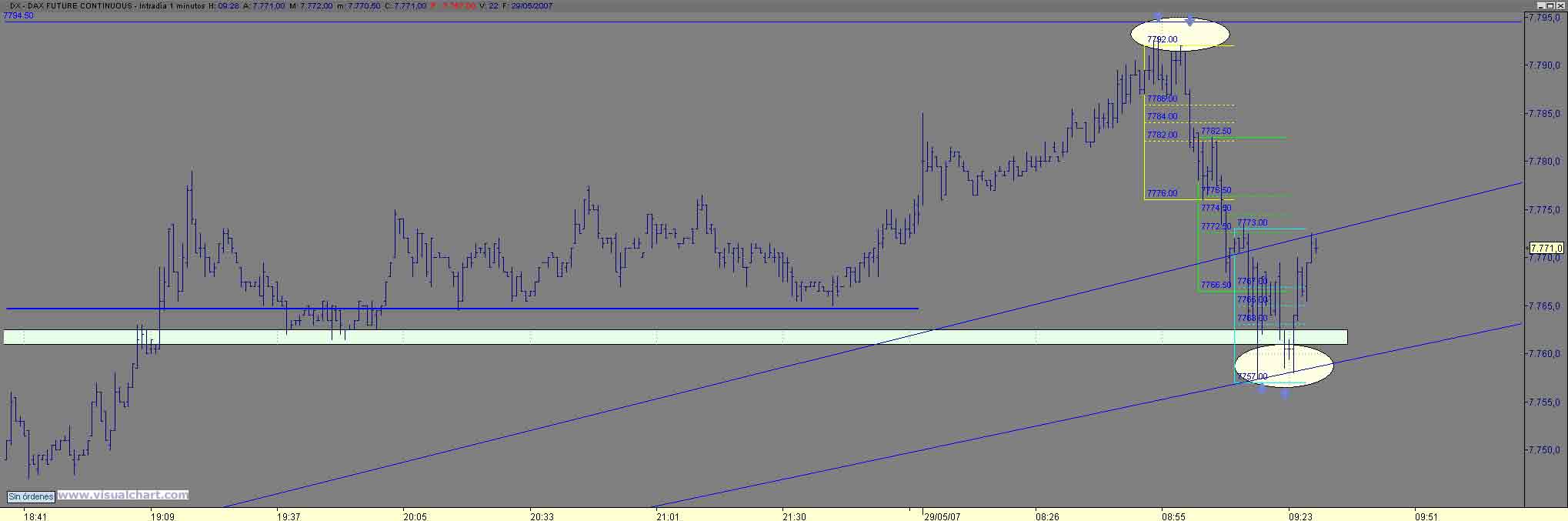 B noches tras la apertura Usa y la tombolo noticiera se superaron los maximos anteriores hasta el 7804 formando tras ello un impulso con retro extendido al 7798 zona de maximos anteriores que ha funcionado como un muro de contencion hasta que al final hemos caido llegando al obj del tercero 7764.50 formado por ese canal bajista desde maximos , no guardar las armas que mañana ya esta aqui Saludos
