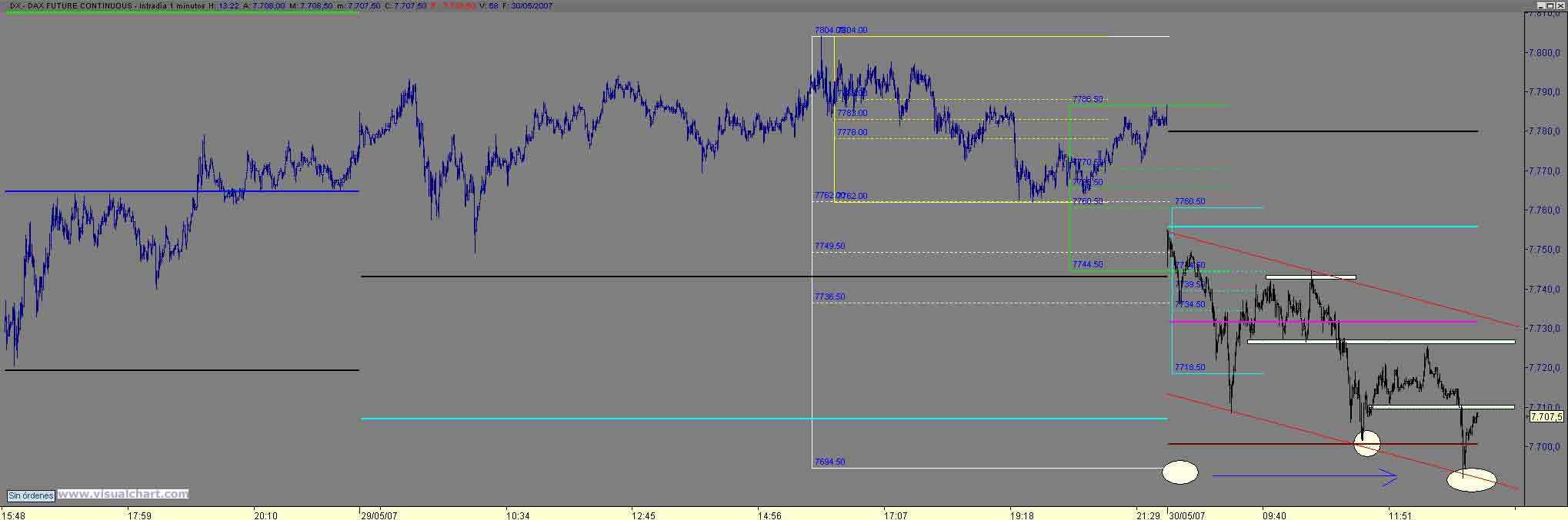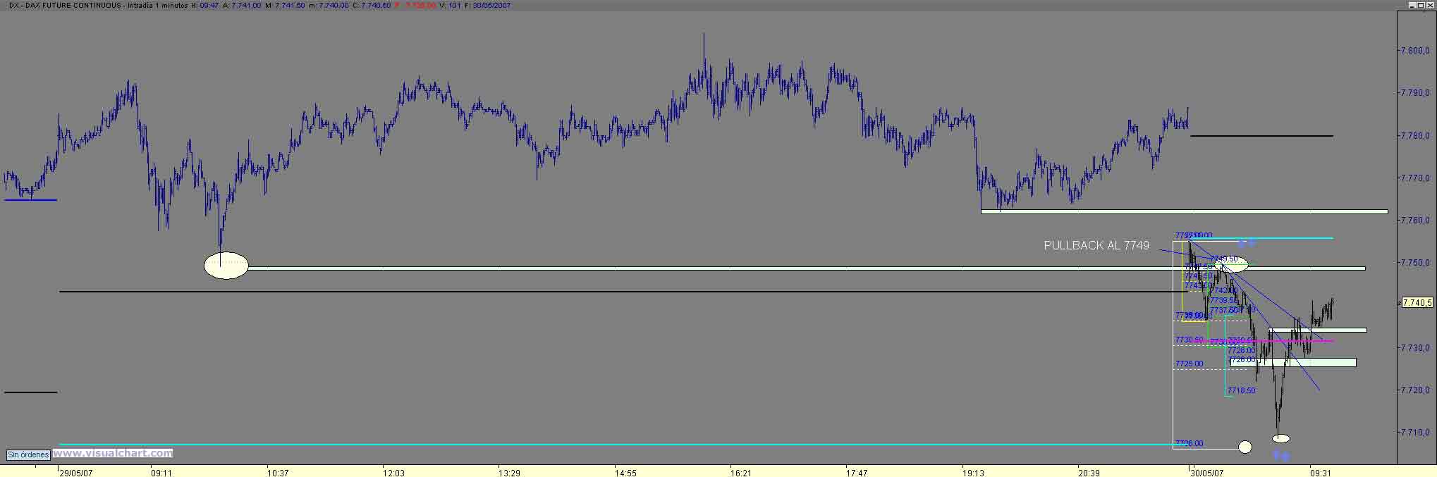 Muy buenos dias descansados deel largo puente bursatil nuestro amigo el Dax quiso reencontrarse a buscar sus amximos anteriores 7794 desde donde sin superralos se deslizo en tres impulsos al nivel del 59 61 coincidente con la direztriz alcista que traemos desde el doble suelo del 7674 donde tomar posiciones largas con obj inicial el 50 61 de Fibo de toda la bajada el 7775 80 y zona de control anterior Saludos