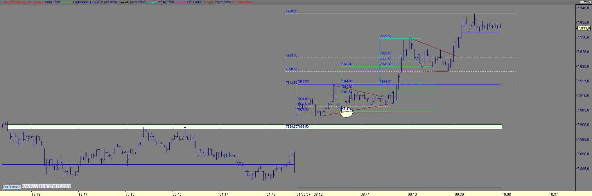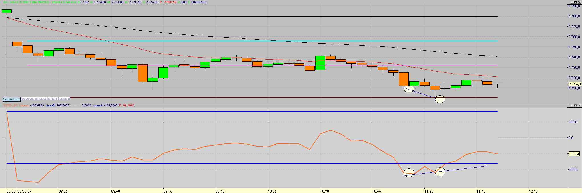 Buenos dias hoy nos despertamos rojillos, y confirmado por ese maravilloso pullback al 7749 punto de partida del segundo impulso que por desarrollo de estructuras nos llevo al 7708 , punto en el que el indicador marcaba clara divergencia alcista buscando en esos largos su media de 20 obj natural y ademas coincidente con elvel perdido del 7736 , apartir de ahi a buscar el retro valido para una segunda entrada y parece que esa zona 24 27 es zona de apoyo para ir a buscar cotas mas altas Saludos