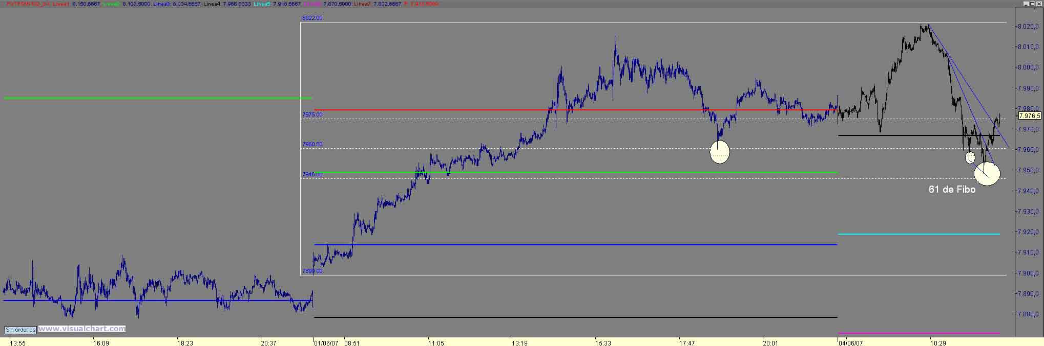 Bueno pues mañana movidita con vaivenes (que es lo bueno) el arreon desde el 70 nos llevo a un doble techo al 8021 desde don el primer nivel de parada el 8000 7995 pero no quiso detenerse y nos llevo justo hasta el 61 de Fibo (7946 ) desde el minimo del viernes hasta el 8021 maximo de hoy donde con divg en indicador buscamos rebote a la zona del 72 75 zona de control anterior , si nos hace un retroceso decente a la zona del 60 62 nuevamente largos a buscar el 7985 Saludos