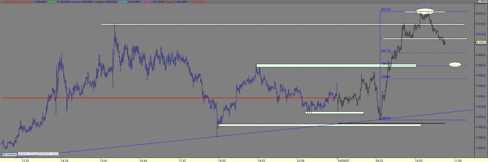 Muy bueno dias nuestro amigo se desperto en el mismo sitio donde cerramos el viernes con lo que a priori las zonas de control eran por arriba el 7995 y por abajo el 7965 7970 ese rango se lo comio antes de la apertura Europea en tres impulsos poara ir a buscar la zona del 70 en la apertura que es zona de pivot y a partir de ahi a volar en busca del 95 8000 sin practicamente un retroceso veremos si no pierde el 92 95 donde nos lleva Saludos