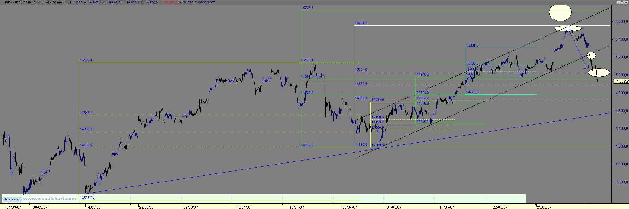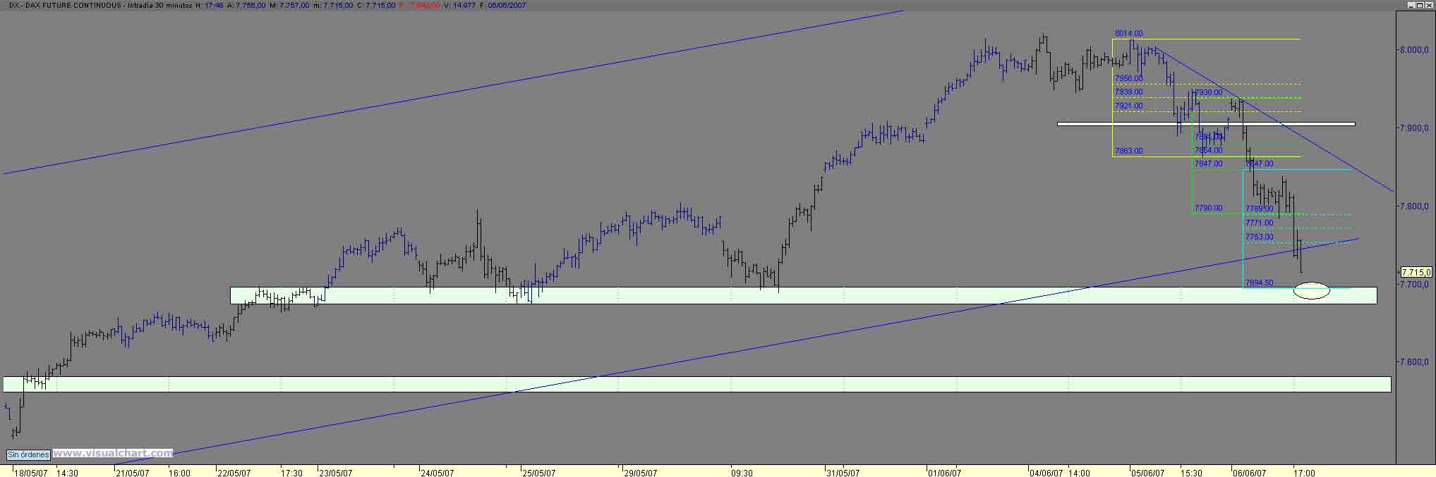 Y continuando con nuestro amigo el DAX pues mirar el graf en 30m cuando esta mañana comentaba que el 7938 era el 50% de Fibo del movimeinto del dia anterior la que nos estaba preparando (yo desde luego no lo pensaba) pero se fue a cumplir su obj de 3 (7693.50) que ademas es zona de control anterior (7675 7690) y deja tocado del ala la direztriz alcista desde el doble suelo en 6424 para mañana la disyuntiva es por abajo ver el 7570 7580 y por arriba volvel al 7800 asique a pensar esta noche Saludos