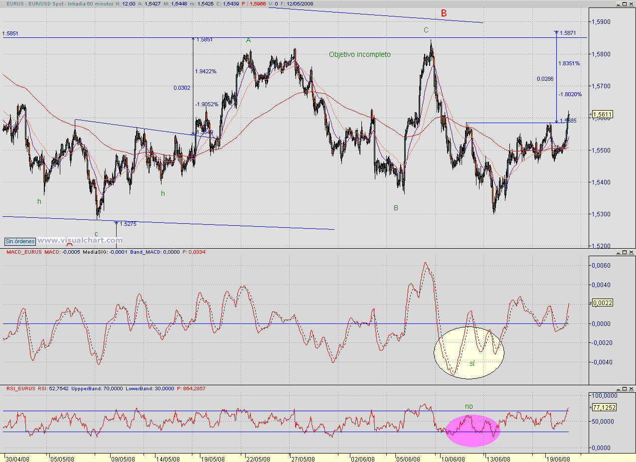 En eso mismo me estaba yo fijando antes de leerte, en el MACD 60", que sí que apoya la subida pero esperaba que el precio confirmase la divergencia bajista que hizo ayer. Lástima que no tuviese en cuenta que al final SIEMPRE se cumple que los objetivos están pa cumplirlos. El objvo del HCH seguía sin completarse después de dos intentos pero como al segundo le faltó tan poco pues lo di por bueno. En fins, si ya lo dice el refrán, que a la tercera va la vencida, juas.