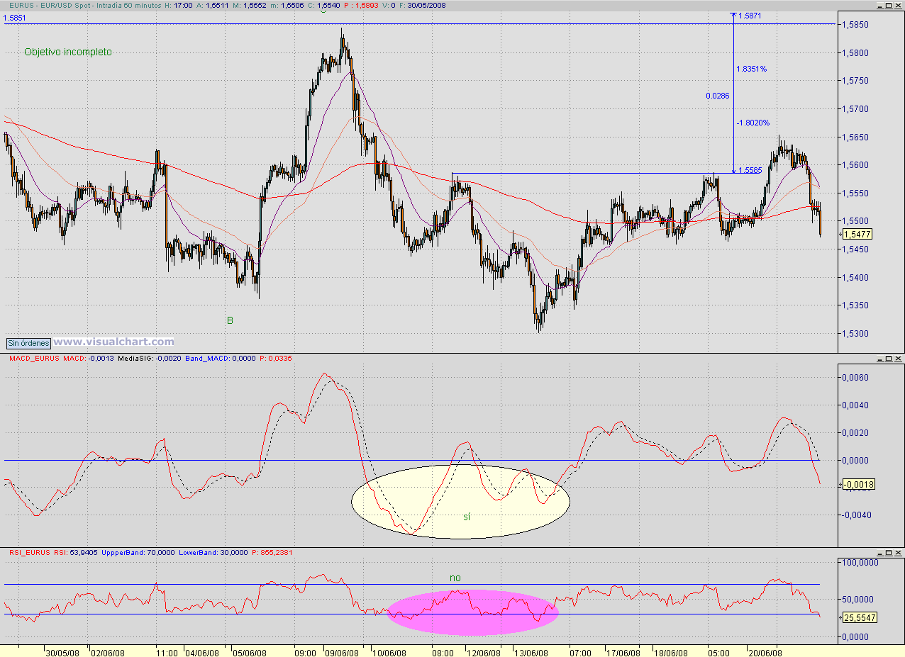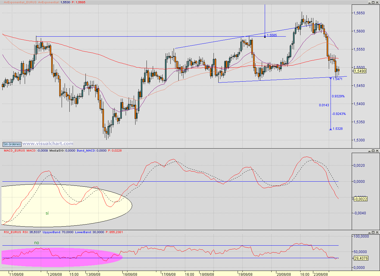 Y bueno, dejando los asuntos del corazón y volviendo al trabajo pues hoy lo veo más claro que el viernes. Me parecía que podía subir por haber roto la línea de cuello del hch-inv pero, que no, que no me lo creo. No me extrañaría ver cómo deshace la figura y la transforma en un hch de continuación bajista. En fins, que en el fondo me da igual porque para el intradía eso no afecta muxo pero lo digo por si a alguien le interesa.