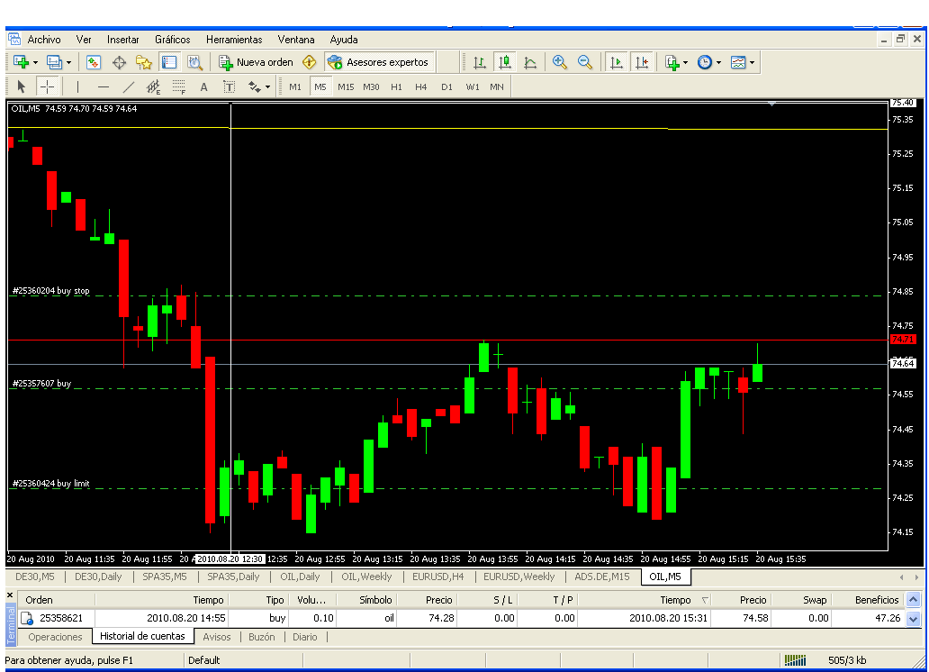 guevon escribió:Puedes poner una orden de compra en 74,25 y esperar (antes quitas la orden de perdida mayor), quieras o no... tal y como se mueve este indice, creo que te puede dar alguna satisfacion y te permitira abrir tanto por arriba o por abajo alguna orden mas (tambien de compra) antes que se desplome a 73,50 o aproximado....