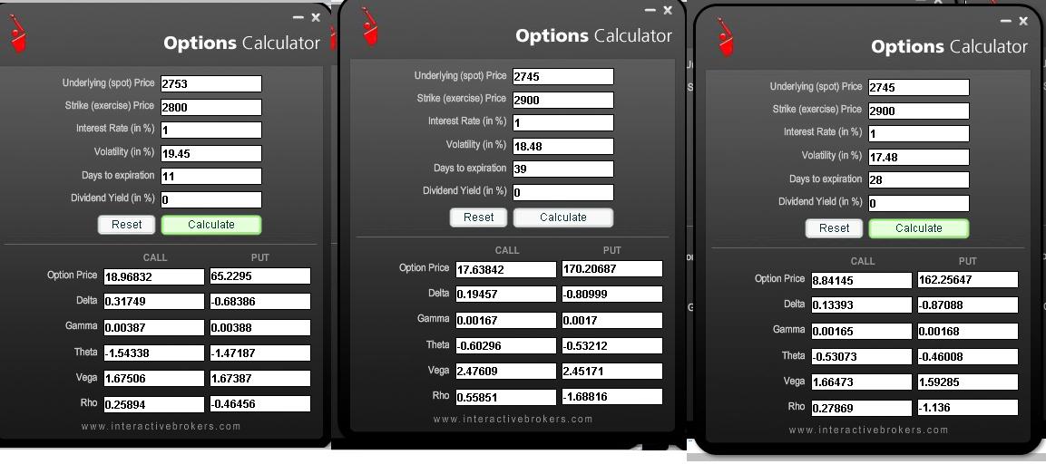 He tenido en cuenta el efecto de los dividendos y he puesto como valor de spot el que proporciona Interdín. Así en la imagen, de izquierda a derecha, call 2800 sept con 11 días a vencimiento, call 2900 oct. con 39 días a vencimiento, y a la derecha call 2900 sept con 28 días a vto. (serían los que quedan desde el vencimiento de septiembre). He supuesto en el último caso que el spot sigue en el mismo punto y que la volatilidad ha bajado un punto, todo ello ciencia-ficción ya que está claro que no es predecible.