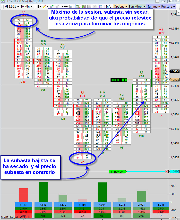 Tengo dos configuraciones del TapePlotter, una con barras de 12 pips de rango y otra con barras de 30' que corresponden a los brackets del Market Profile... digamos que con la primera hago un zoom para ver el desarrollo de la subasta más de cerca y con la segunda tengo una visión general de la sesión. En estas barras de 30' cuando en mínimos o máximos de la sesión no se ha secado la subasta, es decir no se han cruzado todos los contratos disponibles en ese pip o tick, la probabilidad de que el precio vuelva ahí a dejar a 0 el bid o el ask (depende de si estamos en mínimos o en máximos) es muy alta. No la tengo tabulada pero es extremadamente raro que no suceda, hablando siempre de máximo o mínimos absolutos de la sesión. Te adjunto un gráfico.