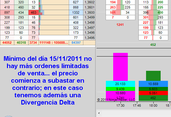 Te adjunto el gráfico de hoy mismo... el volumen va disminuyendo conforme el precio va bajando y nos va dejando algunas señales de agotamiento hasta que cuando llega al 1,3495 no hay más sell limit y si no hay mas interés vendedor el precio se girará... y subastará al contrario.