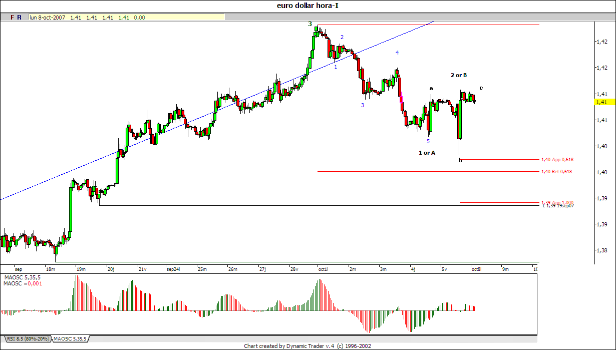 Como el mercadillo está aburrido y extrañamente me rula el euro dolar (llevo 1 semana en Visual Chart y este es el 2º día que me va, tiene webs la cosa) me he entretenido con el bicho. Al final hizo un cierre por debajo del mínimo del día del máximo ( señal muy buena esta cuando está en objetivos) pero no menteré gracias a la susodicha teknología punta sin "n". Pero no creo que sea tanto una oportunidad de venta (pal que se haya metido rápido sí) como lo va a ser de compra pues me paice que el tope es el final de una tercera y no va a retroceder allavaquetevá ya que esta extendió la quinta. Ahí van unos retrocesos desos. No creo que la corrección esté terminada. Enfins.