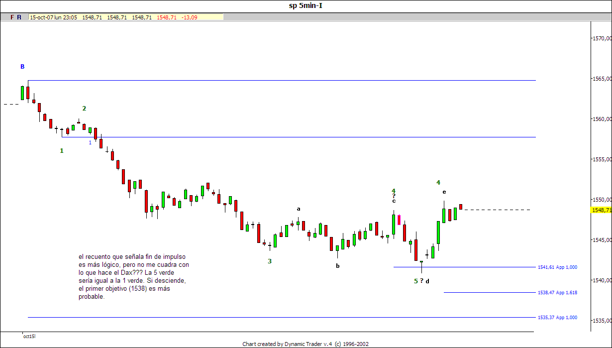 que cuando más dormío estás, la cosa va y se mueve y te quedas fuera de juego. Creo, visto lo visto, que estamos en la onda 4 de la C en el Dax. Por las dimensiones que tiene el asunto todavía sigo pensando que no es una tercera (lo que pintaría un panorama muuuy bajista) sino una C. De todas formas habría cierto retroceso al finalizar este impulso (mayor si es C). Vamos a probar con esas tonterías del tiempo y hoy lo voy a hacer siguiendo las directrices de Bill Williams. Según él, la onda 4 normalmente acaba en una proyección del 138 ó 162 de la duración desde el pico de 1 hasta el de 3 ( u sea la duración de las ondas 2 y 3) proyectadas desde el final de 2 (o el principio de 3 según se mire). Pues bien, según este planteamiento las horas clave para que acabe esta recuperación serían entre las 15:30 y las 17:45, u sea, lo de siempre, que los yankees tienen la palabra. Lo que me mosquea es que parecía terminada la C yankee y esto no cuadra con lo otro. La única cosa que se me ocurre es que el SP haya hecho un triángulo expansivo como onda cuarta y falte un empujón que le lleve más abajo y a la par el Dax haga su quinta. A ver...