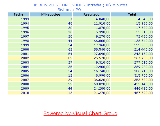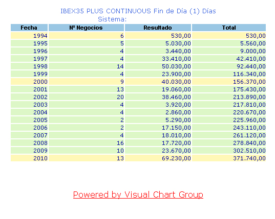 El gráfico que adjunto muestra las estadísticas del FIbex diario, En Visual 5 las estadísticas están bastante mejoradas, aunque tiene algunos fallos todavía de diseño y funcionalidad, el fallo más importante repercute en los sitemas, sucede que en VChart 4 los sistemas me daban unas estadísticas diferentes, siendo el mismo sistema, a como las da el VChart 5. Después de buscar donde estaba el problema, encontre que no era culpa del sistema sino de una función que siendo la misma no es igual que en VChart 4, al final la solución ha sido modificar los sistemas que utilizan dicha función, con lo cual tengo el mismo sistema con los mismos resultados de estadísticas en las dos versiones, pero con un codigo diferente de sistema. Esta vez no pienso decirles nada a los de Visual, que se caliente la cabeza como lo he tenido que hacer yo. Aún estoy esperando después de bastante tiempo que me respondan sobre algunas cuestiones que les hice.