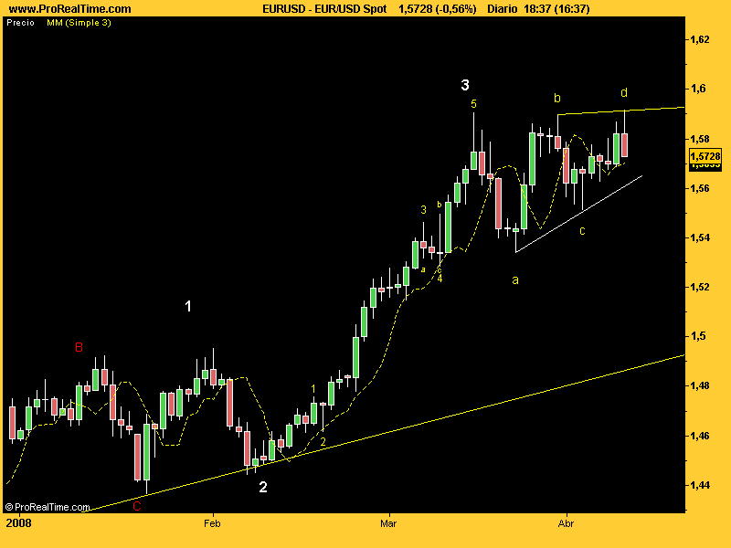 Pienso que el triangulito del que hablas será roto al alza y cuando caiga a tocar su base, que sería el fin de la onda e del tringulín y del mercado alcista también, si no he cambiao para entonces de opi cosa muy normal en mi, me abriré mi primer paper largo en Forex junto con los paper cortos que para entonces supongo tendré abiertos en CFD´s, a ver que tal me va.