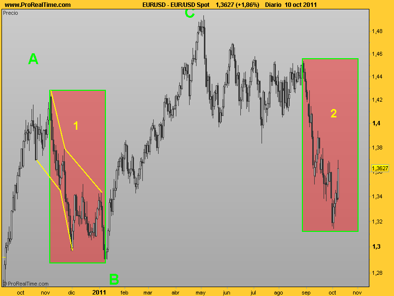 Pues haciendo una comparanza, se observa que este retroceso desde agosto no es todavía mayor que el de finales del año pasado. Desde mi punto de vista para considerar que en agosto se hizo un máximo y comenzó un retroceso de grado superior al descenso del año pasado, se requiere que sea mayor y más rápido que los retrocesos de la subida. Comparando el rectángulo 1 y el 2, se ve que pintaba así, pero al llegar casi al 100% en menos tiempo, se ha parado y viendo lo que veo en el corto plazo, me da que el precio se va a salir por la parte de la derecha. Según mi criterio entonces todo sería un recorte que se inició en mayo y la tendencia seguiría siendo alcista.
