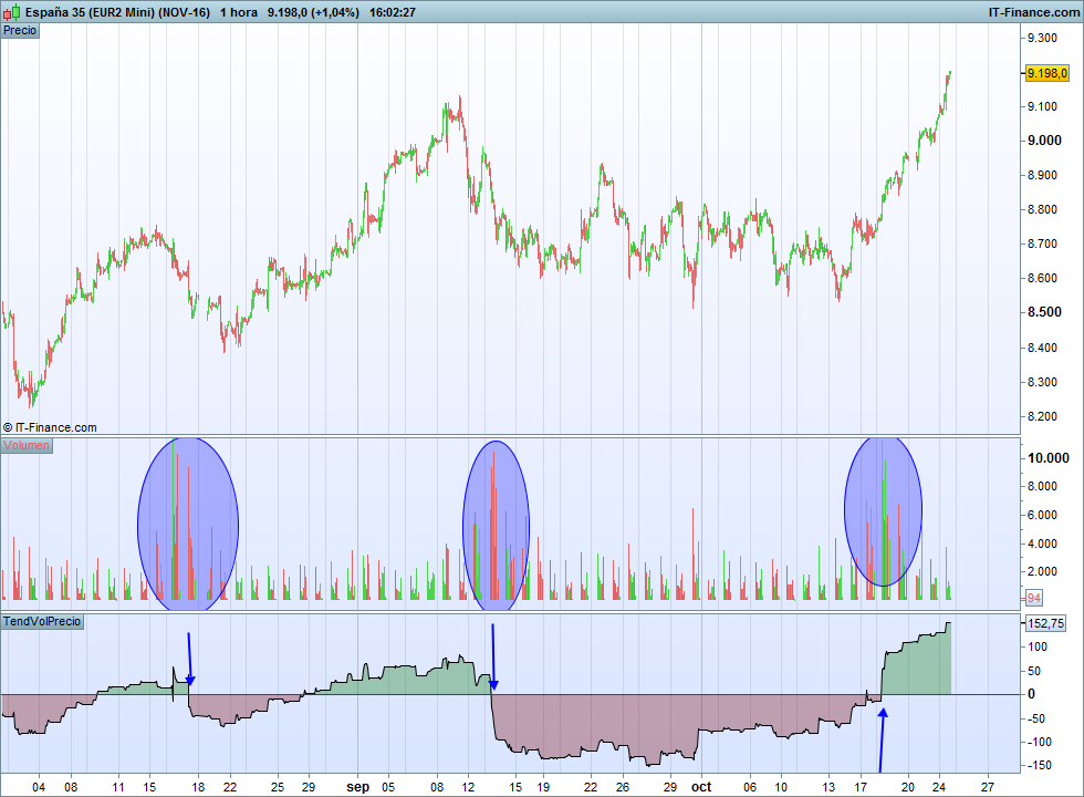 El aumento del volumen en ocasiones no se da, hay movimientos tendenciales que no están apoyados por aumento de volumen pero si en el volumen neto comprador o vendedor y algunas veces ni eso en índices