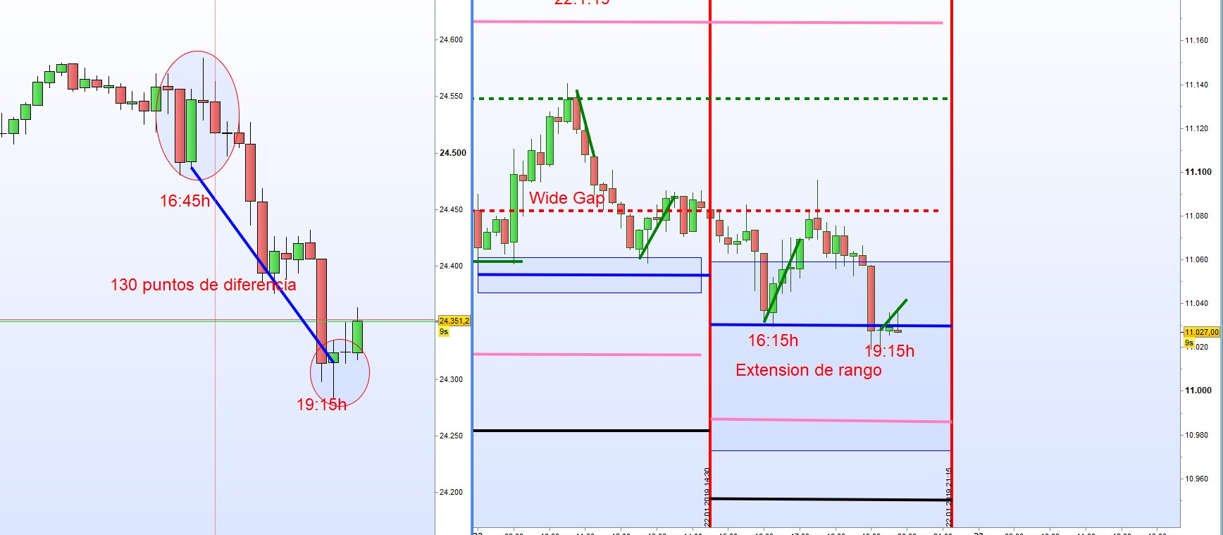 Comparamos las entradas con el precio de los DJIA FUT. Wow, 130 puntos de diferencia en los DJIA FUT. Como es posible? Muy simple el DAX ya ha sufrido una perdida ayer mientras el DOW tenia fiesta.
