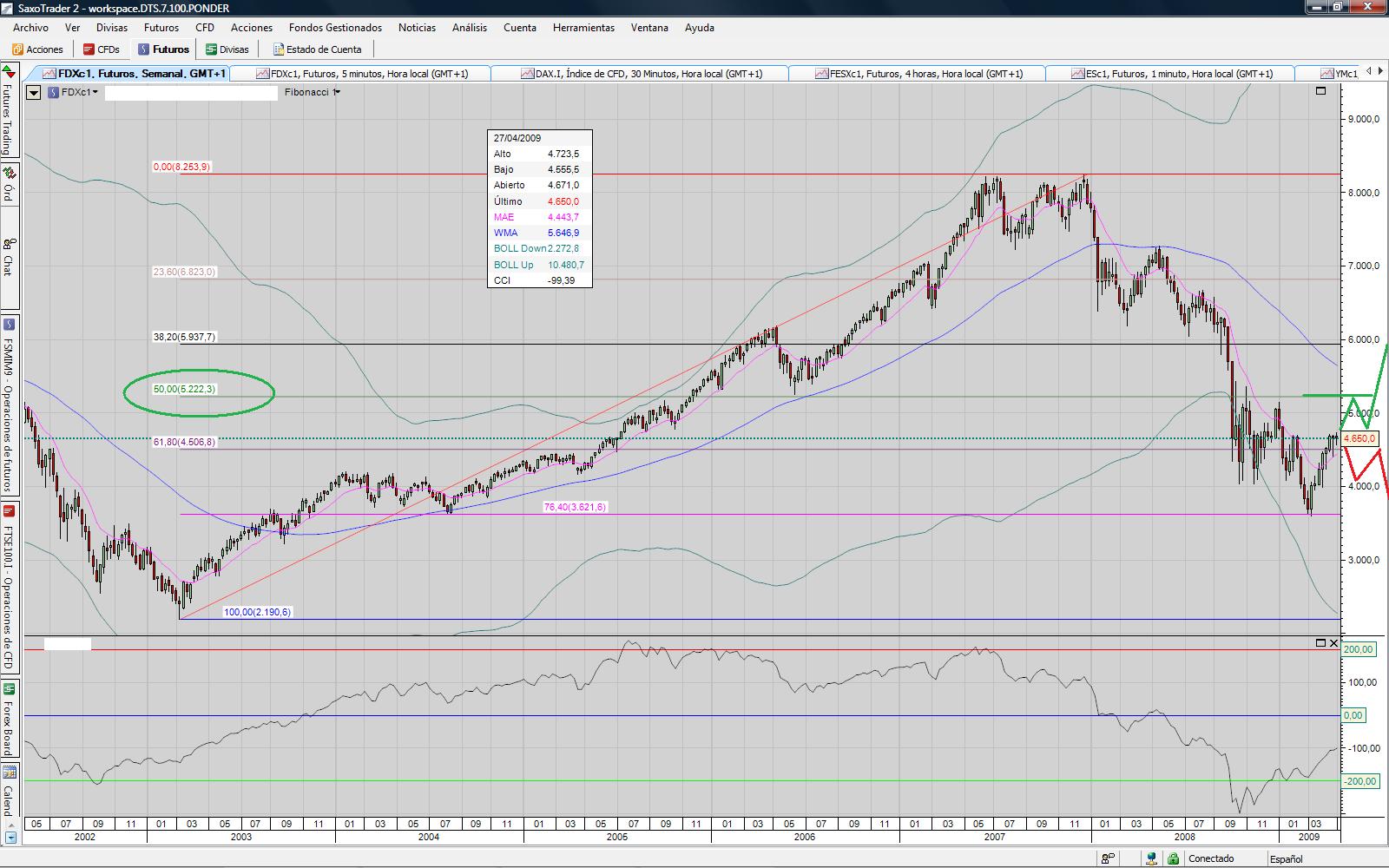 en semanal, y extendiendo los retrocesos desde los mínimos de marzo 2003 hasta los máximos de noviembre 2007, podemos observar ke la corrección se detuvo en marzo 2009 en los entornos del 76,4% de retroceso fibonacci.