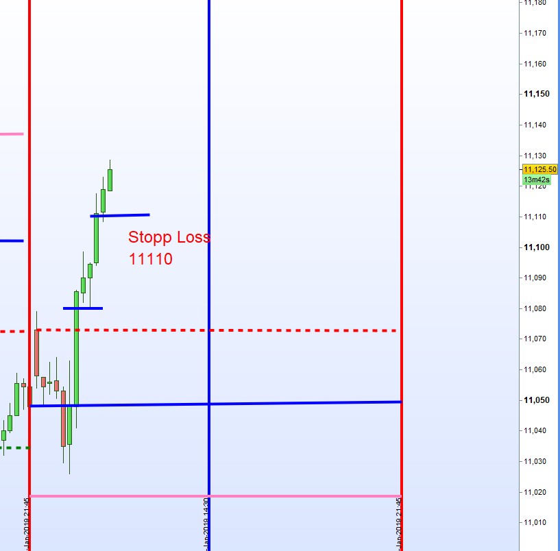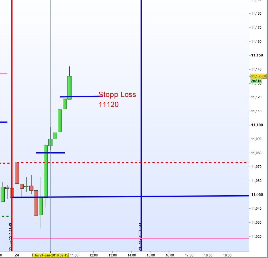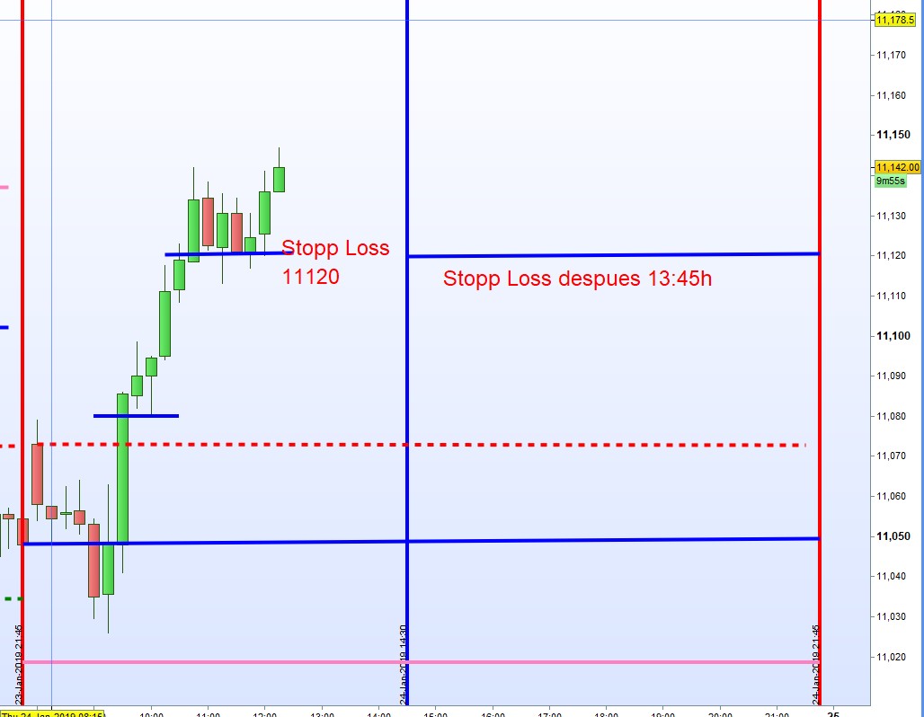 Nos queda un tercio de los contrados con 100 puntos de beneficio. Si el precio continua a subir despues de las 13:45h el stopp loss sera como dibujado. Si bajase antes podemos considerar el stopp loss anterior. Este es una apreciacion sobre la marcha. Hemos tenido ya un buen dia y hay que proteger los beneficios. A lo mejor habra una extension de rango.