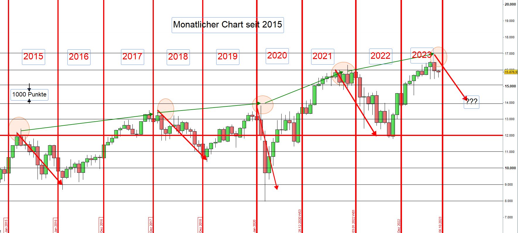 Después de cada máximo de movimiento de +/- 1000 puntos, el DAX ha corregido inmediatamente, o con un retraso de tiempo, en 3000 puntos.