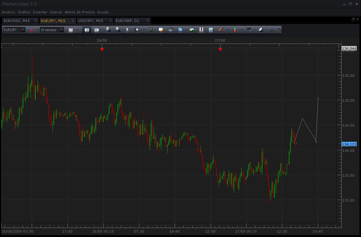 Pero!!! hoy lo he vuelto a hacer y apostando unos dolares y en vez de hacer la figura de ayer lo que ha hecho ha sido la misma figura pero a lreves del todo, y con ello he perdido 25 dolares, y se meha quedado una orden abierta hasta el domingo (apostando a la baja del euro contra el yen), que seguro que la perdere tambien.
