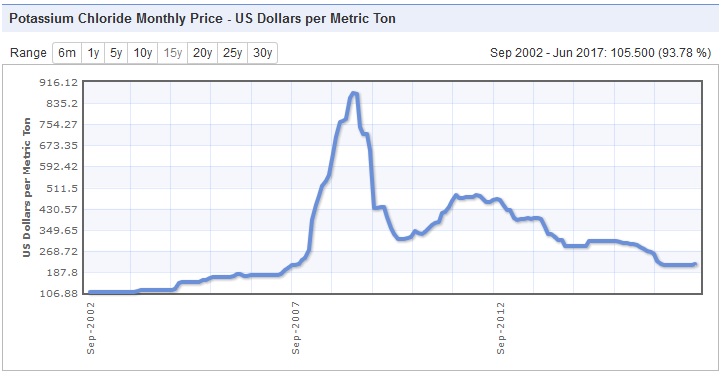 Vemos que desde 2009 era proibitivo invertir en esta empresa porque el driver (los precios del clouro de potassio) estava a caer mes tras mes, hasta que em abril el driver comenco a dar sinales de reversion...