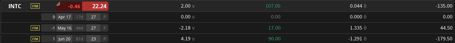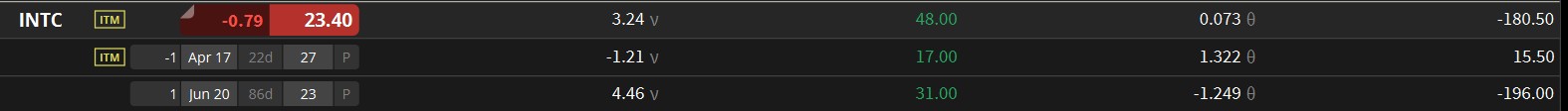 Ayer cuando valoré la situación con la acción en 24.21 recomprar la put27 me costaba unos 3.20 y, aunque no llegué a mirarlo, calculo que esa put que comentas me hubieran dado unos 0.40 dando 60 días o más. Hubiera devuelto más de 1/3 de las primas y estaría esperando 2 meses a que se evaporen los 0.4 y si baja por debajo de 18 o 19 ser asignado o rolar según expectativas.