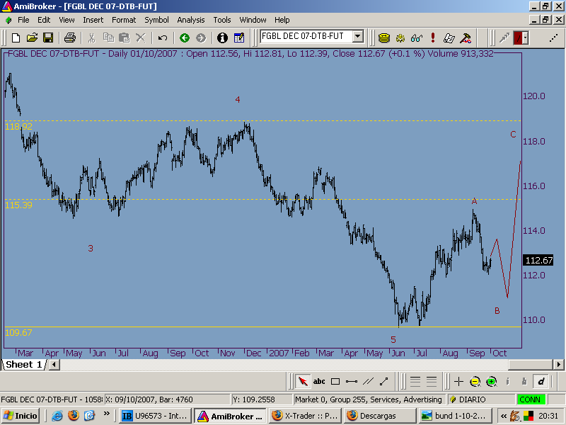 jejejje, hola scalp, no te preocupes yo voy de intras rapidos si no lo veo claro, y no estoy dentro, suelo cerrar posiciones antes de cerrar el mercado, jejjejej asi duermo a pierna suelta,en diario las 5 pabajo las a hecho de libro,la correccion , la A tambien de libro con un 5, pero la B ya veremos como la hace como tu bien dices, si la hiciese de libro tambien ahora le tocaria subir un poco mas, 113-113,50, no ya mismo, sino tomandose su tiempo,para despues romper minimos del dia 27/9,hasta no se donde pero111-110,50 +-,