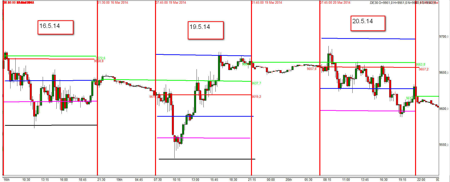 Ahora bien esto no significa que el precio tiene que volver siembre a la apertura. Se puede observar a menudo que el DAX tiene un value area por la manana y otra por la tarde con por ejemplo reversion de la segunda a la primera o de una extension de rango a la segunda zona.