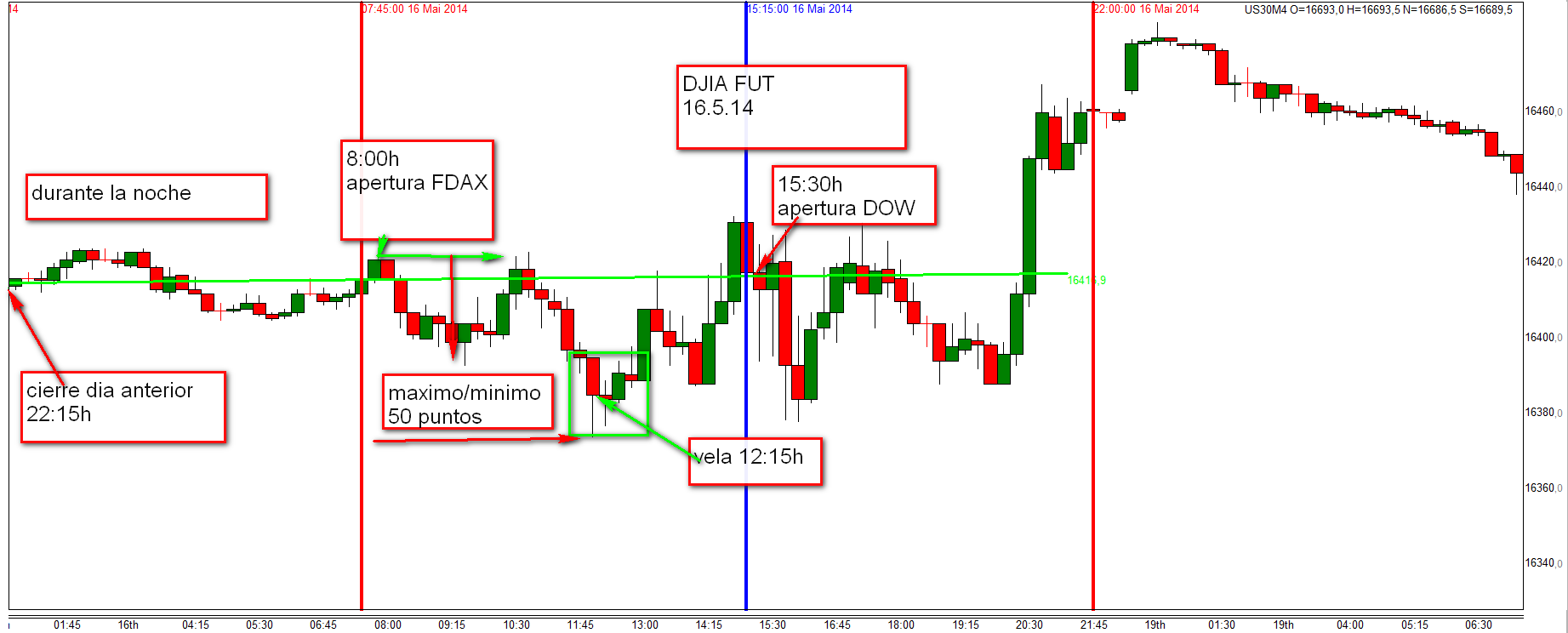 En cuanto el precio se acerca de una zona miro el comportamiento de la Vela de 15 minutos y naturalmente el Heikin Ashi de 3 minutos y tambien el DJIA FUT de 15 minutos. Aunque el ultimo tiene mas importancia por la tarde.