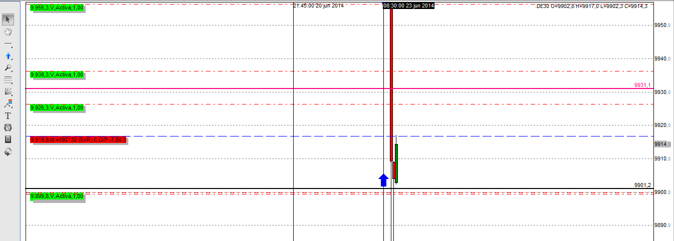 Pues ese día 13.6.14 tan perfecto no está tan claro, a ver veamos entrada en z1L al toque o con la reverse cercana, da igual, el precio cae y llega a la z2L, tenemos vela que cruza de abajo a arriba y le metemos 6, aplicamos timé stop y salimos en el mínimo, pues estamos por debajo de nuestra entrada unos puntitos importantes después no hay reverse fuera del valué área y la entrada del open a esa nueva línea negra pues como que es nueva. Día de pérdida importante, no se qué es lo que ven pero eso es lo que claramente marca la estrategia