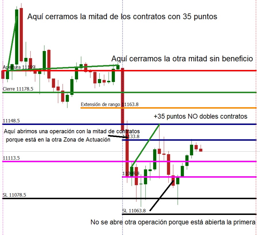 5. Se abre una operación con la mitad de contratos en la segunda zona de la Extensión de Rango que obtiene un beneficio de 35 puntos.