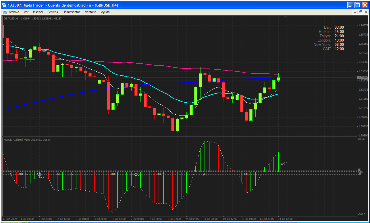Encontre que la EMA de 21 se acomoda mejor al movimiento reciente del precio (Mirar este sistema viewtopic.php?t=11225 en el sistema de 5 minutos Phillip hace un excelente uso de la EMA de 21….que no es la excepción en este sistema,, yo ya la se manejar…y es muy buena para saber donde serán los rebotes en tendencia). La SMA de 89 da a conocer la dirección de la tendencia, cuando el precio esta encima de esta el sentimiento es alcista, mientras que si el precio esta por debajo el sentimiento es bajista. La SMA de 200 integra en si la interpretación media de las noticias para largos periodos. La EMA de 365 es la de mas largo termino pero le da mas peso a la información reciente, debo admitir que esta EMA no juega un rol muy importante. hay en algunas ocasiones que el precio la prueba luego de haber pasado por todas las otras medias móviles por eso la uso.