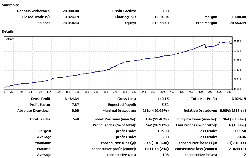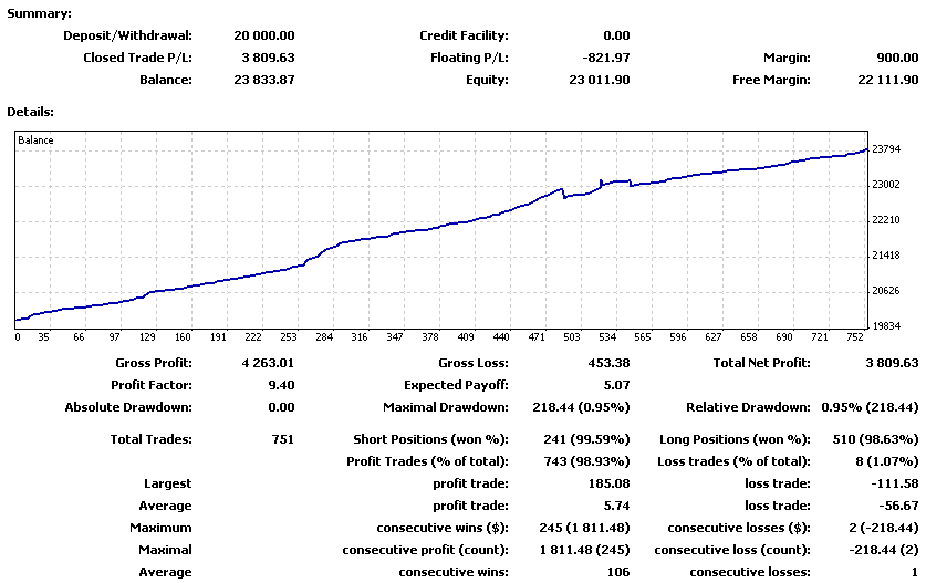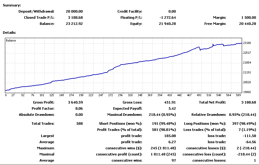La experiencia durante año y medio en hedging arroja una fiabilidad media en torno al 91%-93%, como se puede ver en esta prueba estamos en el 98,91%. Un 1% en estas fiabilidades es muchísimo y resulta que tenemos casi 8 puntos de diferencia. Así que debemos suponer que según sigamos manteniendo la estrategia la fiabilidad tenderá a disminuir hacia ratios más cercanos al 92%.